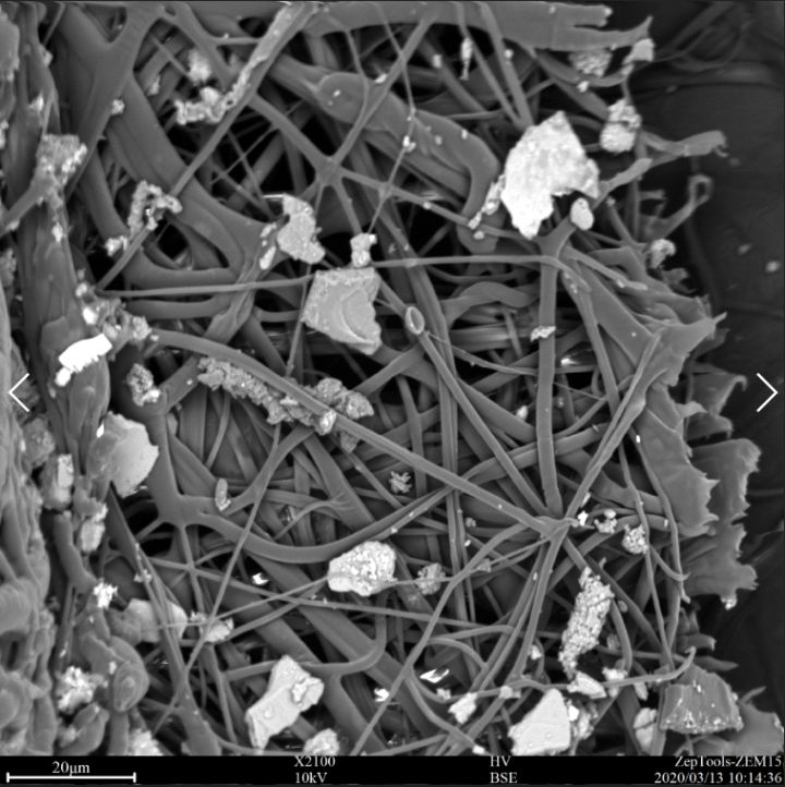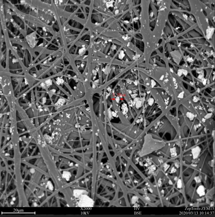 為避免污染對人身體造成傷害,我們將口罩戴到車載吸塵器上,在高污染環(huán)境下抽氣5分鐘,這時的吸氣量與人呼吸4小時相似,以此作為參考。我們可以看到口罩過濾層上密密麻麻的遍布著2 - 15 um大小的顆粒,如果沒有口罩的過濾,這些顆粒將全部被吸到肺部,并對人體造成傷害。